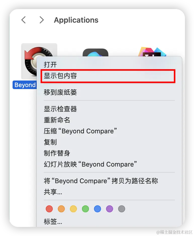 1)进入Mac应用程序目录下,找到刚刚安装好的Beyond Compare,路径如下 /Users/{用户名}/Applications/Beyond Compare.app/Contents/MacOS/。