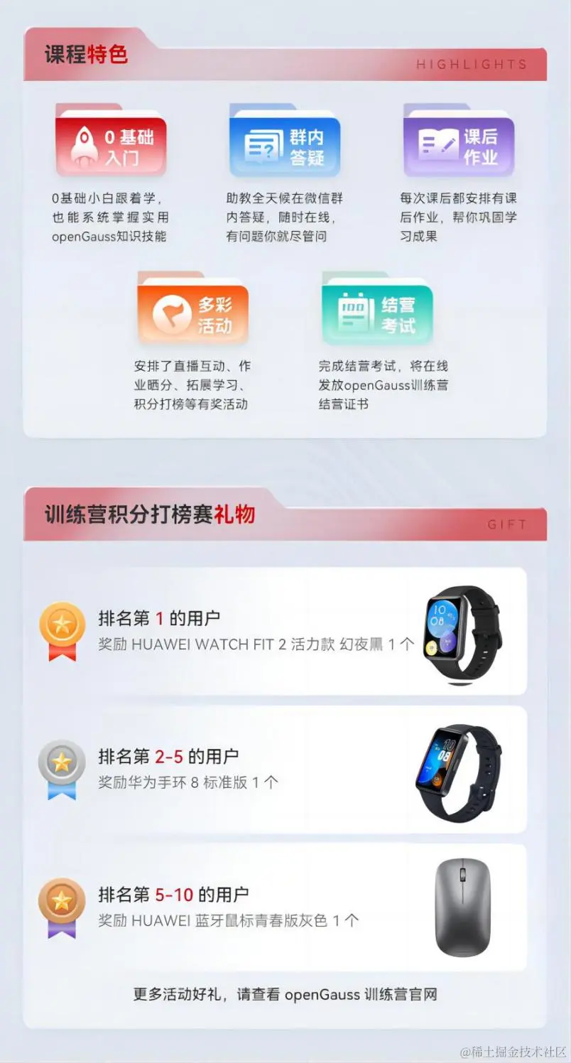 值得一提的是,训练营特别设置了积分打榜赛环节。只要完成openEuler训练营的课程学习、课后作业、结营考试、微认证均可以获得积分。积分排名第一的学员将奖励HUAWEI WATCH GT 4 (46mm) (曜石黑黑色氟橡胶表带),排名第二至第五的学员将奖励HUAWEI FreeBuds 5i(有线充无线耳机星际黑);排名第六至第十的学员将奖励华为路由BE 3 Pro Wi-Fi 7(3600Mbps)。