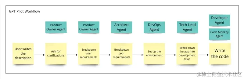 然后,GPT Pilot配合LLM(目前为GPT-4)明确应用需求,并最终编写代码。它使用多种AI代理(AI Agents) 来模仿开发机构的工作流程。