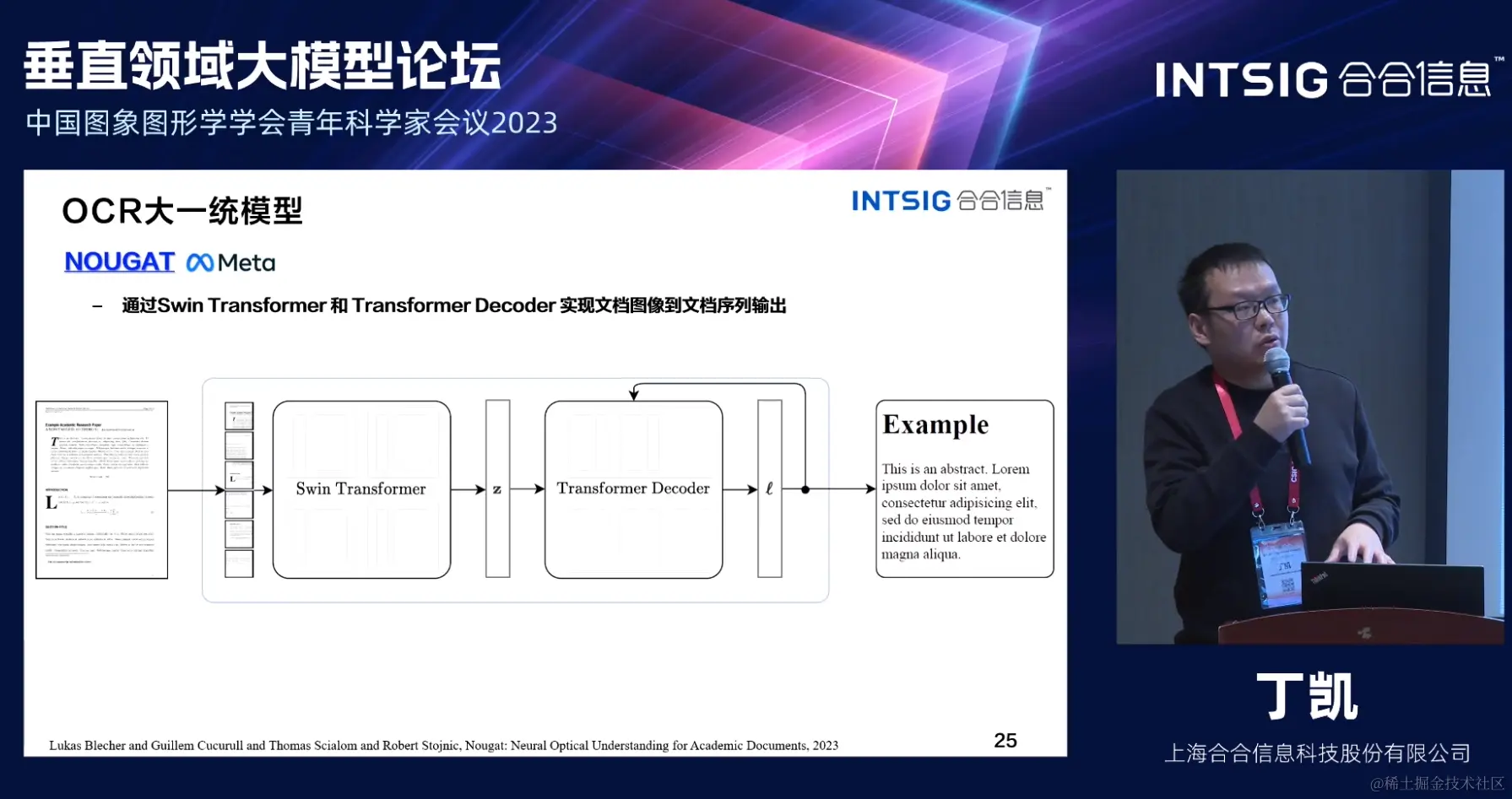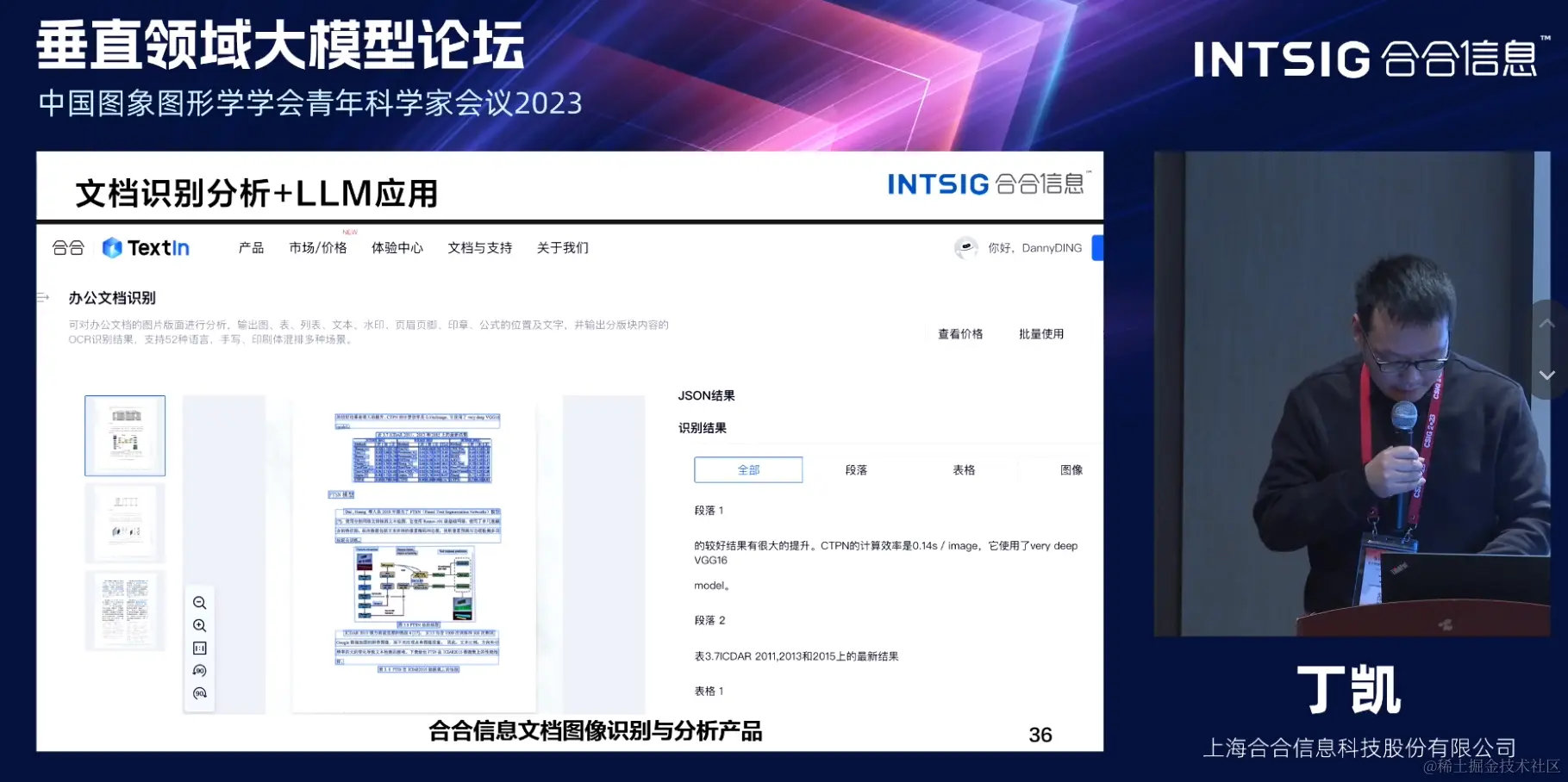 2023年12月28-31日,由中国图象图形学学会主办的第十九届CSIG青年科学家会议在中国广州隆重召开,会议吸引了学术界和企业界专家与青年学者,会议面向国际学术前沿与国家战略需求,聚焦最新前沿技术和热点领域,共同探讨图象图形学领域的前沿问题,分享最新的研究成果和创新观点,在垂直领域大模型专场,合合信息智能技术平台事业部副总经理、高级工程师丁凯博士为我们带来了《文档图像大模型的思考与探索》主题报告。
