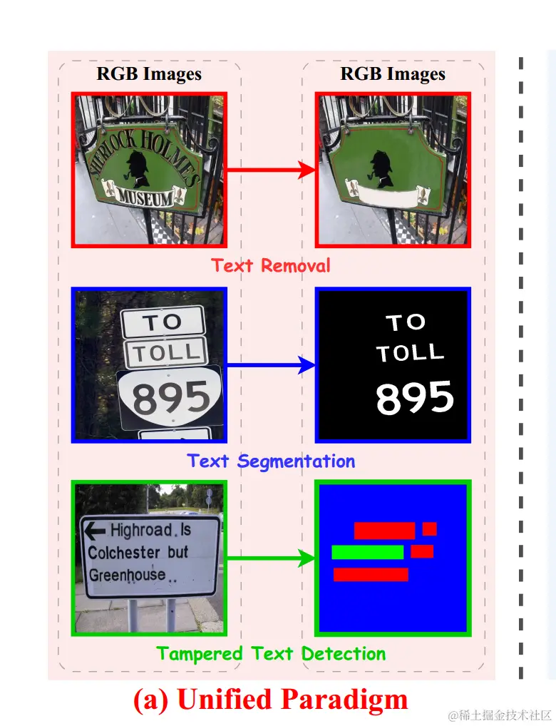 - 篡改文本检测任务:将篡改文本检测任务定义为篡改文本、真实文本和背景类别的每像素分类,进而UPOCR分别为篡改文本、真实文本和背景分配红色(255, 0, 0)、绿色(0, 255, 0)和蓝色(0, 0, 255)颜色。在推断过程中,通过比较预测的RGB值与这三种颜色的距离来确定每像素的类别。