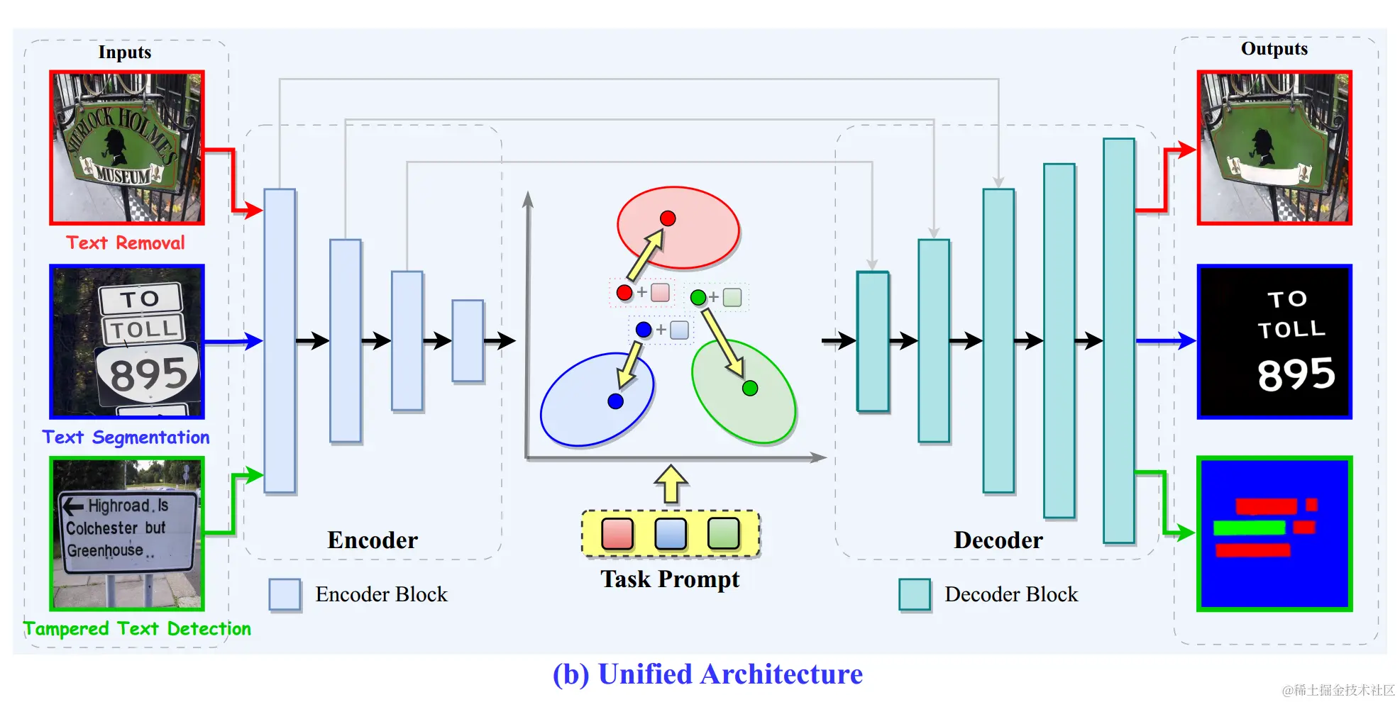 如图所示,作者通过采用基于ViT的编码器-解码器实现了一个统一的图像到图像翻译范式来处理各种像素级OCR任务。其中,编码器-解码器架构采用了ViTEraser作为主干网络,编码器包括四个顺序块,每个编码器块包含一个用于下采样的块嵌入层和Swin Transformer v2块。解码器部分包括五个顺序块,每个解码器块包含一个用于上采样的块分割层和Swin Transformer v2块。另外,作者在编码器-解码器架构中引入可学习的任务提示,对应的提示被添加到编码器生成的隐藏特征的每个像素上,推动由编码器生成的通用OCR相关表示朝着任务特定区域。随后,解码器将调整后的隐藏特征转换为特定任务的输出图像。基于这种架构,UPOCR能够在极小的参数和计算开销下简单而有效地同时处理多样的任务。