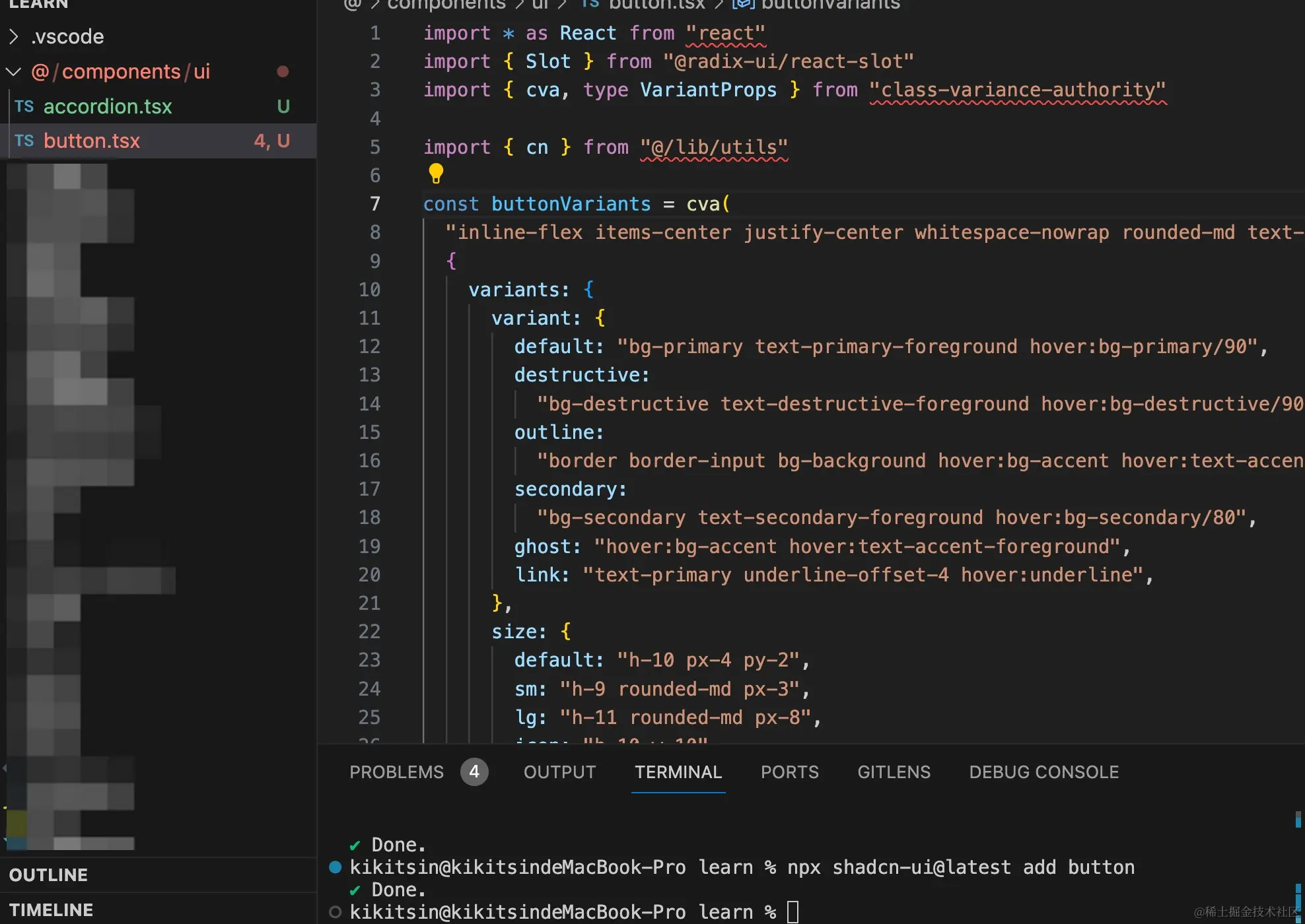 shadcn/ui 是建立在 Radix UI之上的。与其他流行的库(如 MUI、ChakraUI、React Spectrum)不同的是,shadcn/ui 不是一个可下载的 NPM 包。相反,你可以通过终端命令将 shadcn/ui 组件集成到你的代码库中,该命令会安装底层依赖并直接复制组件源代码到你的代码库中,以便进一步进行修改。