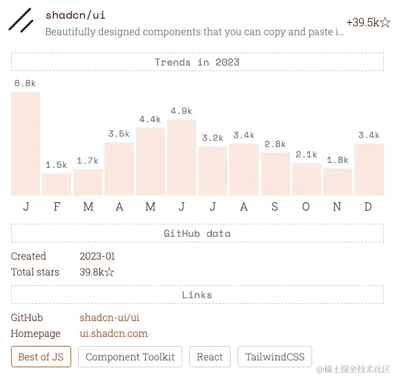 今年最热门的项目是 shadcn/ui,这是一个使用 React 编写的 UI 组件集合,通过 TailwindCSS 可以进行自定义样式。