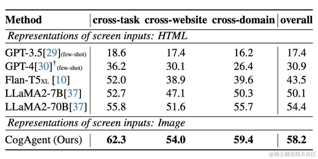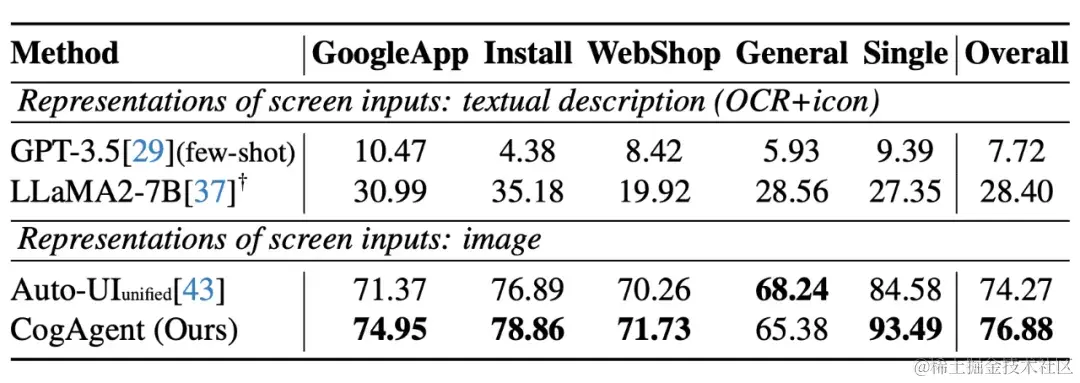 在电脑、手机等 GUI Agent 的数据集上,CogAgent 具有较大的优势,大幅超过所有基于 LLM 的 Agent: