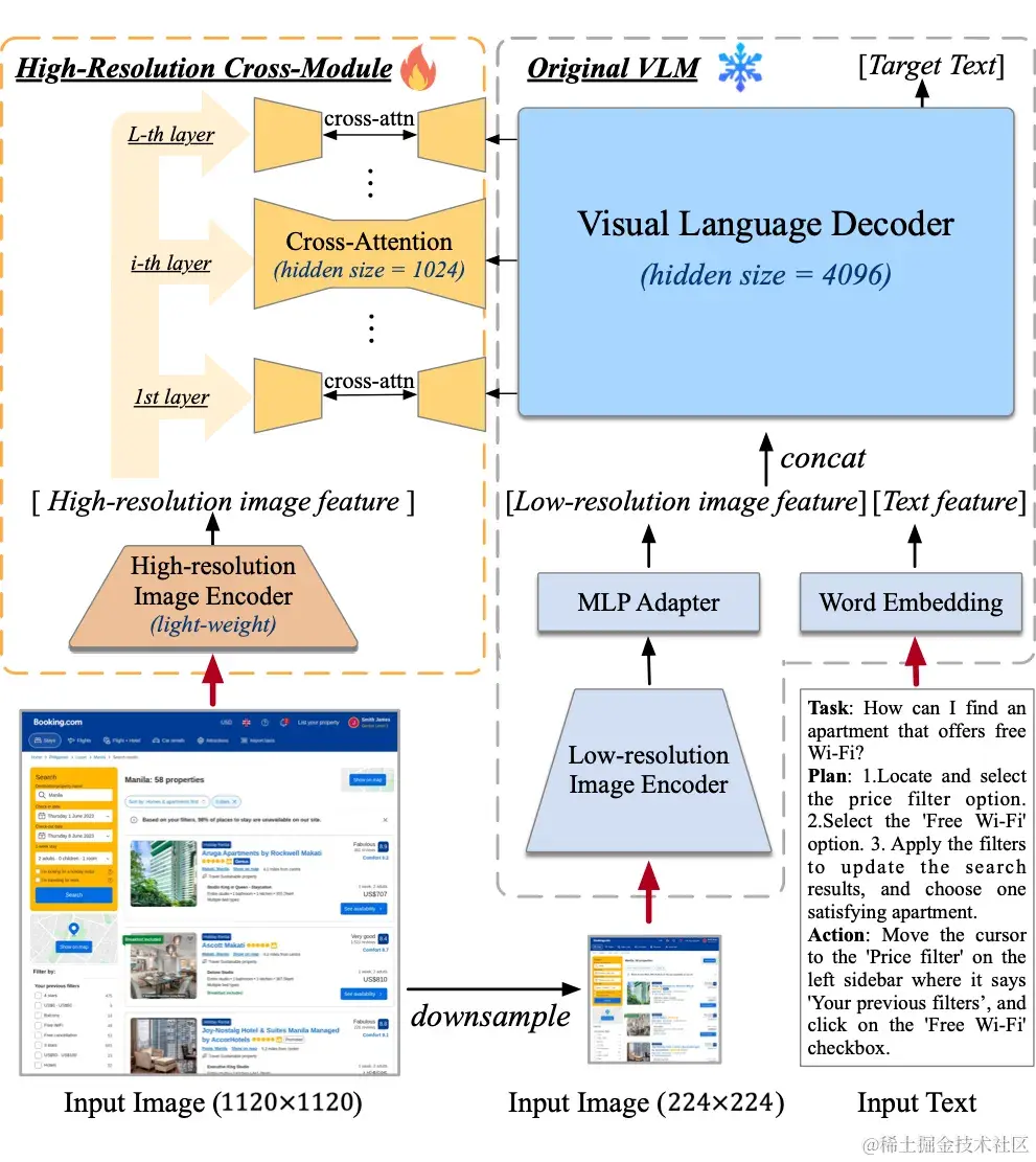 然而,分辨率的提升会导致图像序列急剧增长,带来难以承受的计算和显存开销——这也是现有多模态预训练模型通常采用较小分辨率图像输入的原因之一。对此,我们设计了轻量级的“高分辨率交叉注意力模块”,在原有低分辨率大图像编码器(4.4B)的基础上,增加了高分辨率的小图像编码器(0.3B),并使用交叉注意力机制与原有的 VLM 交互。在交叉注意力中,我们也使用了较小的 hidden size,从而进一步降低显存与计算开销。