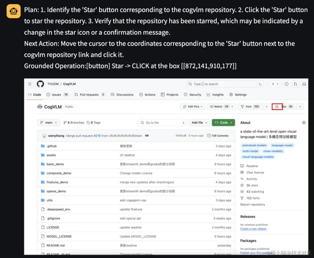 一个小彩蛋 :若提问 CogAgent,应该如何给 CogVLM 仓库点星标(作者按:这也是 CogAgent 的仓库),可以将截图和问题 Can you advise me on how to "star cogvlm repo" 输入给模型: