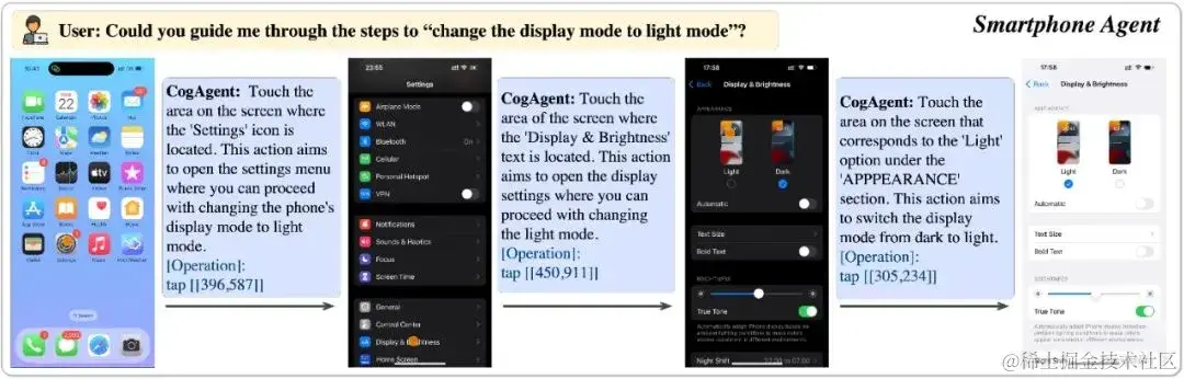 CogAgent 可以应用于包括电脑、手机的各种场景。**受益于 GUI Agent 的可泛化性,CogAgent 能在各类没见过的场景与任务上都取得良好的性能。**下图是手机场景下的一个例子。论文中展示了更多示例,覆盖了 PPT、手机系统、社交软件、游戏等各类场景。