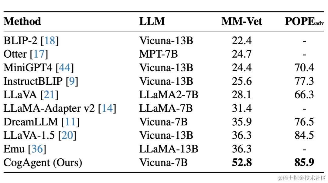 CogAgent 在图像理解的综合能力也有相当的提升,在 9 个经典的图像理解榜单上(含 VQAv2,STVQA, DocVQA,TextVQA,MM-VET,POPE 等)取得了通用能力第一的成绩。