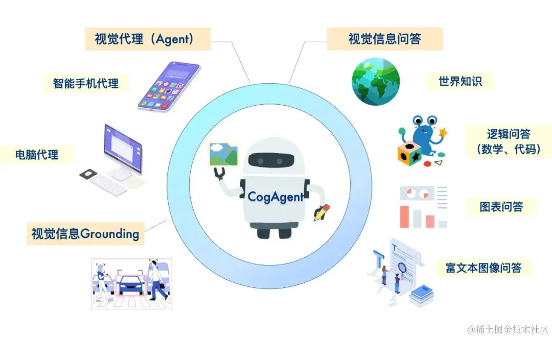 CogAgent 是一个通用的视觉理解大模型,具备视觉问答、视觉定位(Grounding)、GUI Agent 等多种能力,在 9 个经典的图像理解榜单上(含 VQAv2,STVQA, DocVQA,TextVQA,MM-VET,POPE 等)取得了通用能力第一的成绩,并在涵盖电脑、手机的GUI Agent数据集上(含 Mind2Web,AITW 等),大幅超过基于 LLM 的 Agent,取得第一。
