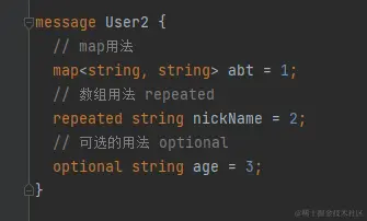 字段还能支持 map ,数组和 optional(可选的字段),用法看下图: