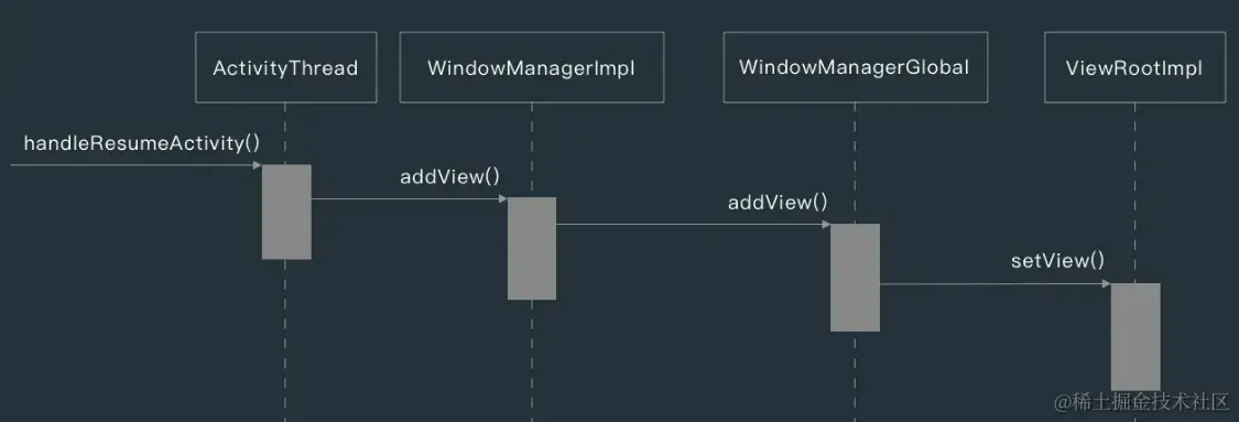 - 调用Activity的onResume():处理View的呈现。performResumeActivity()处理Activity的onRestart onResume的生命周期,通过wm.addView 时才创建 ViewRootImpl,且关联 ViewRootImpl、DecorView。