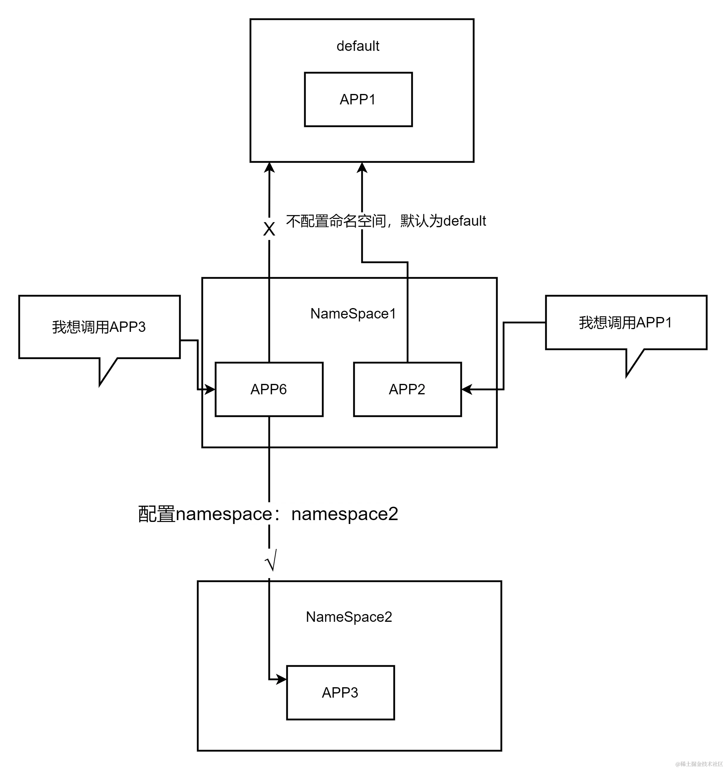 如果服务没有部署在合适的命名空间下,就会导致相关的服务器请求无法到达,在这里给大家看一个逻辑结构图就可以了解到: