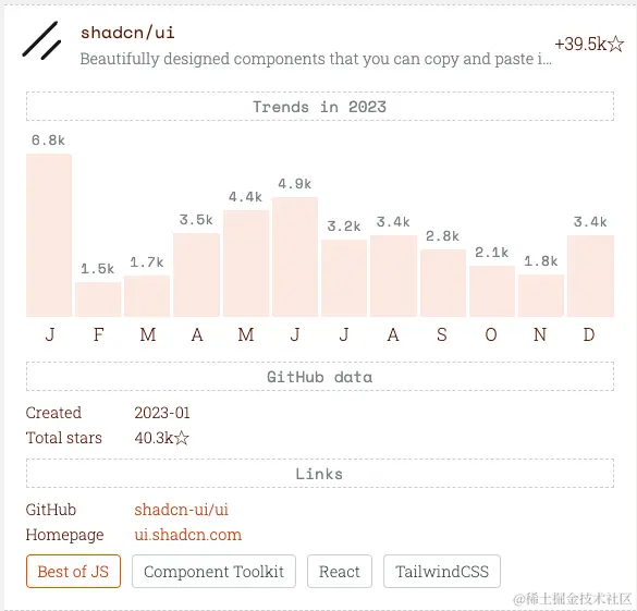 今年(2023)登顶的项目是 shadcn/ui,一顿 CV 操作即可引入项目使用。
