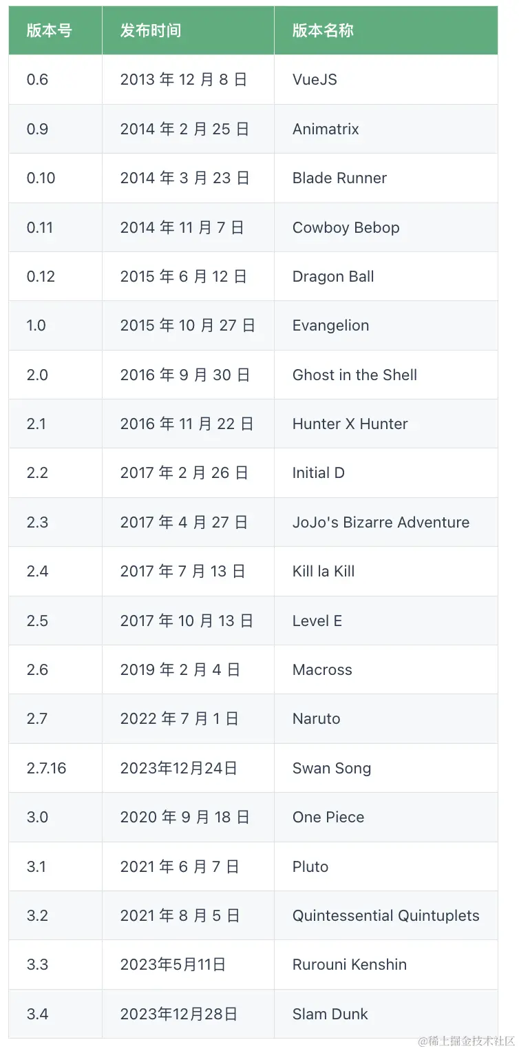 作者介绍了 Vue 0.6 - 3.4 各个版本名称来源,挑几个最近的: