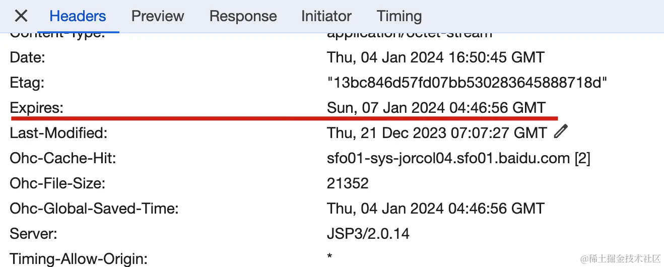 如下图,服务端在返回的 Header 里面设置了 Expires字段,表示该资源被浏览器缓存,并设置了过期时间