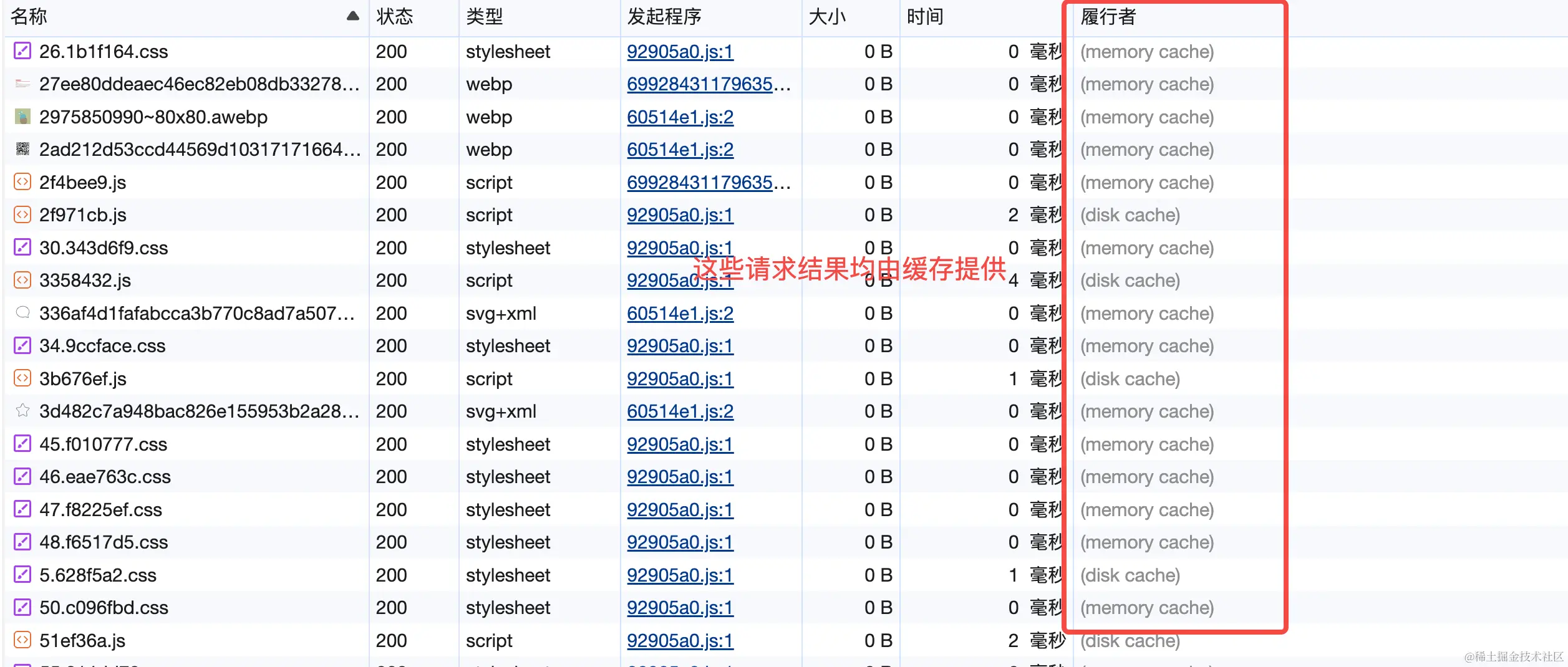 如下图所示,这些结果虽然请求状态为 200,但是是来自缓存