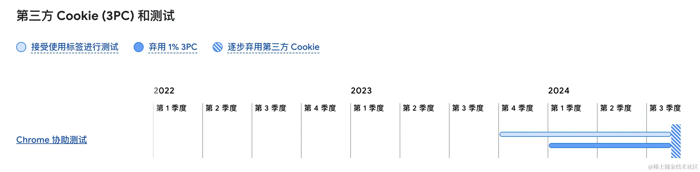 Chrome 计划自 2024 年 1 月 4 日起,将为大约 1% 的 Chrome 稳定版浏览器停用第三方 Cookie,并于 2024 年第 4 季度在开发版浏览器、Canary 版浏览器和 Beta 版浏览器中完全停用第三方 Cookie。