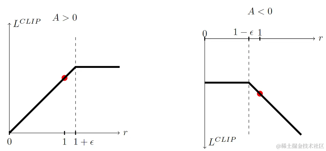 图 1. 图片展示替代函数 LCLIP 的一个项 (即单个时间步) 随概率比率 r 变化的情况,分为正优势情况 (左侧) 和负优势情况 (右侧)。每个图中的红色圆圈表示优化的起始点,即 r=1。请注意,LCLIP 是这些项的累加。
