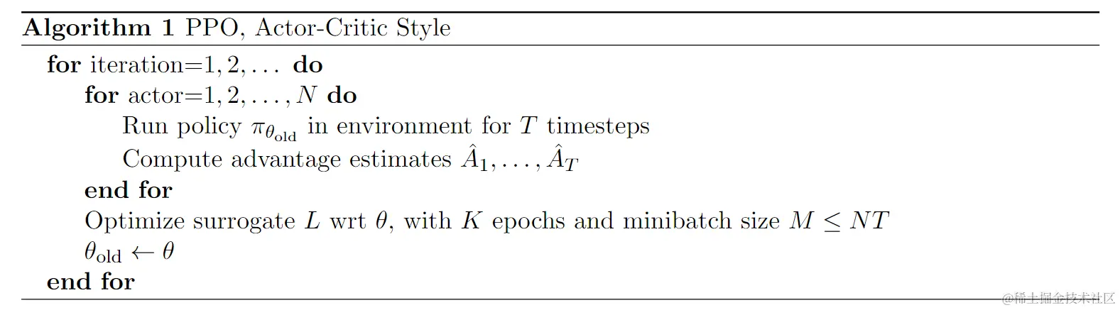 下面显示了一个使用固定长度轨迹段的近端策略优化 (PPO) 算法。每次迭代,N 个 (并行) 参与者中的每一个都收集 T 个时间步长的数据。然后我们在这些 NT 时间步数据上构建代理损失,并使用小批量 SGD (或通常以获得更好的性能使用 Adam) 对其进行 K 个 epoch 优化。