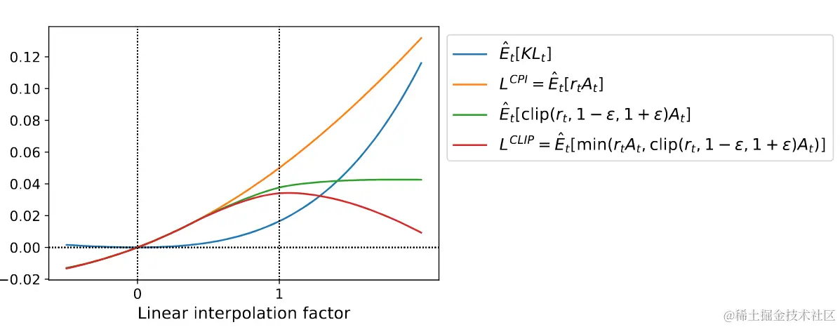 其中 ϵ 是一个超参数,比如 ϵ=0.2。这个目标的动机如下所述 : min 函数内的第一项是 LCLIP。第二项 clip(rt(θ),1−ϵ,1+ϵ)A^t 通过截断概率比率来修改替代目标,这样就消除了使 rt 超出区间 [1−ϵ,1+ϵ] 的激励。最后,文中取截断和未截断目标的最小值,因此最终目标是未截断目标的下界 (即一种悲观的界限)。在这个方案中,只有在使目标变好时才忽略概率比率的变化,并在使目标变差时将其纳入考虑。对于 θold 附近 (即 r=1),注意到 LCLIP(θ)=LCPI(θ),但当 θ 偏离 θold 时它们会变得不同。图 1 绘制了 LCLIP 中的单个项 (即单个 t);请注意,概率比率 r 在优势为正或负时被截断为 1−ϵ 或 1+ϵ。