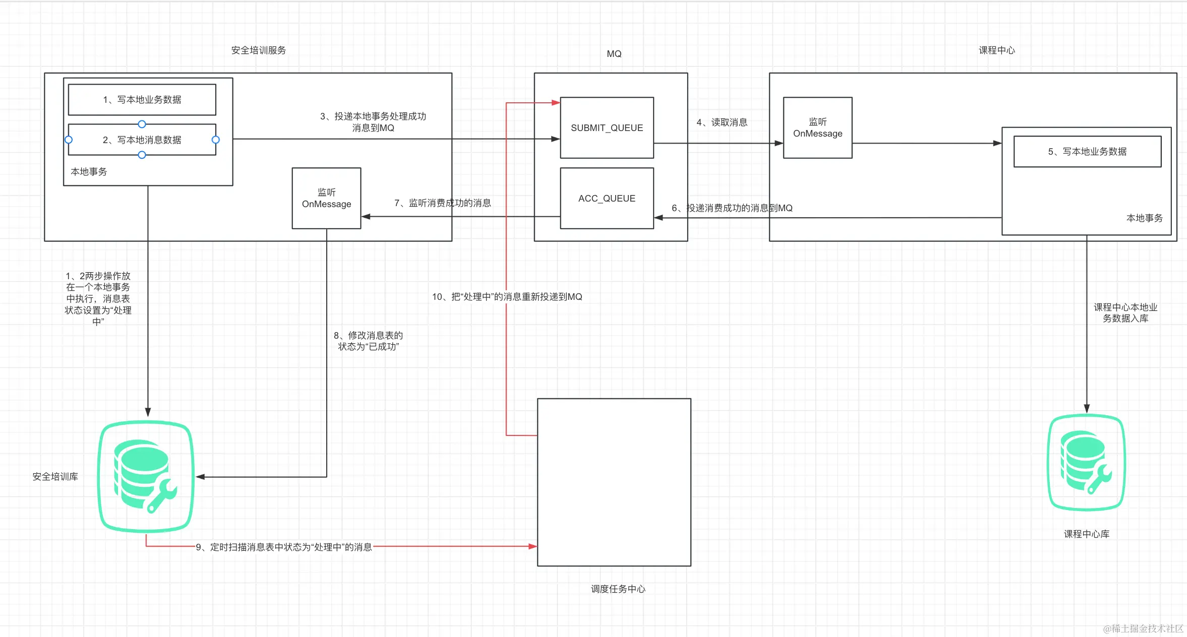 - 调度任务中心会定时捞取消息表中状态为“处理中”的消息(上图第9步),重新投递到MQ中让课程培训中心重新消费(上图第10步),在这个过程中作为消费者的课程培训中心需要保证消息的幂等性。