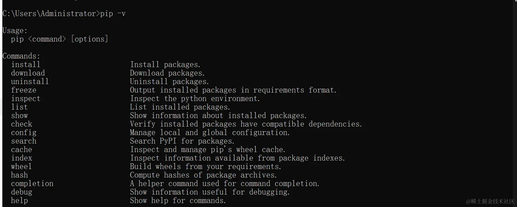 cmd命令行输入pip -v,下图表示 pip装包工具已经安装好了
