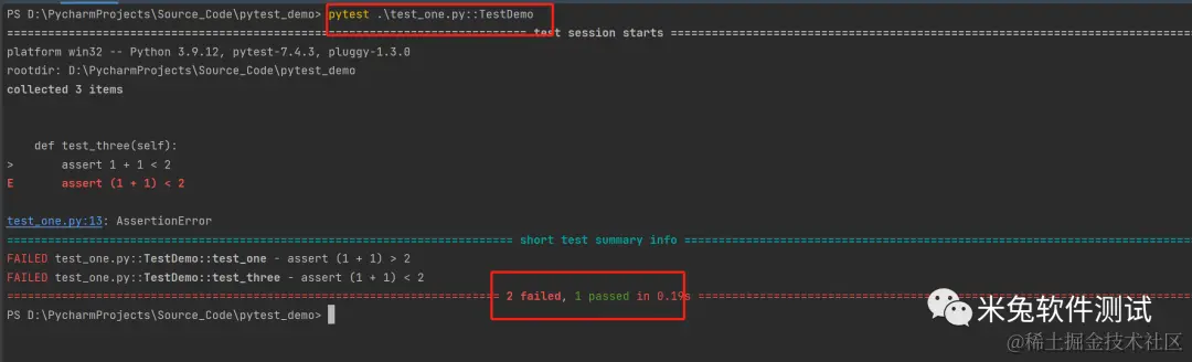 在pycharm终端中执行命令:pytest .\test_one.py::TestDemo