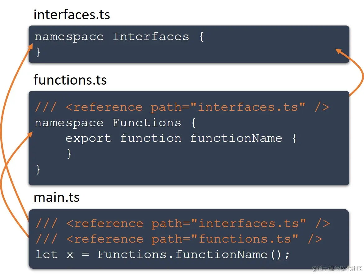 如果对多个文件进行引用,请从最高级别的命名空间开始,然后逐渐向下。 在编译文件时,TypeScript 将使用此顺序。