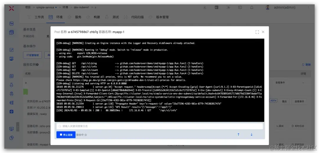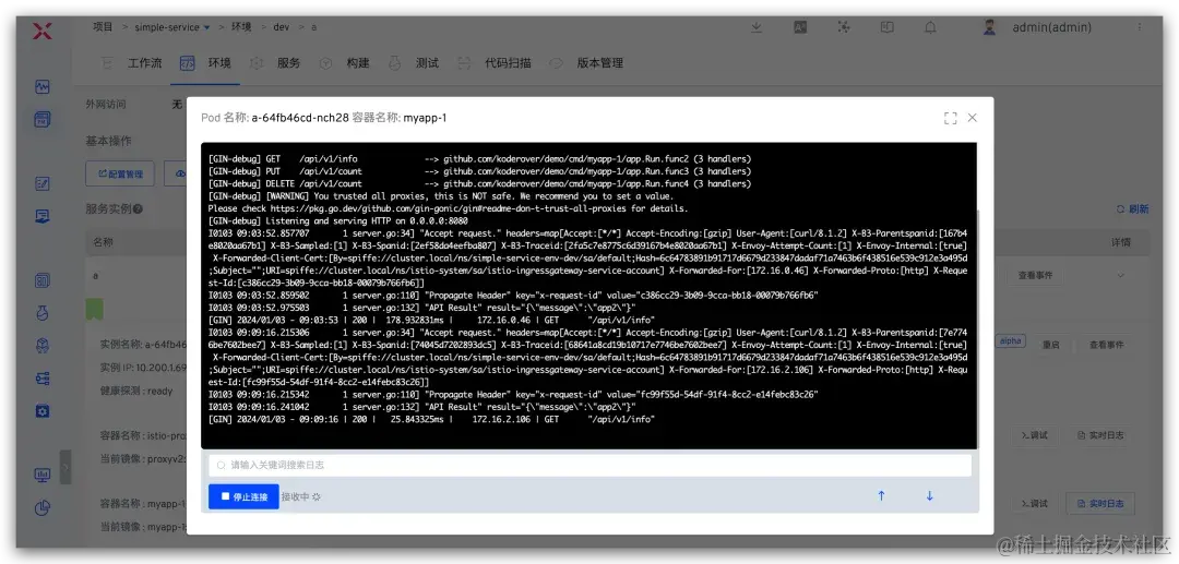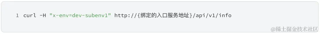 当需要请求服务 a 时,在请求头部加入 x-env=dev-subenv1 即可将请求流量转发到子环境 dev-subenv1 中,实现子环境和 dev 环境的自测联调。测试效果如下所示: