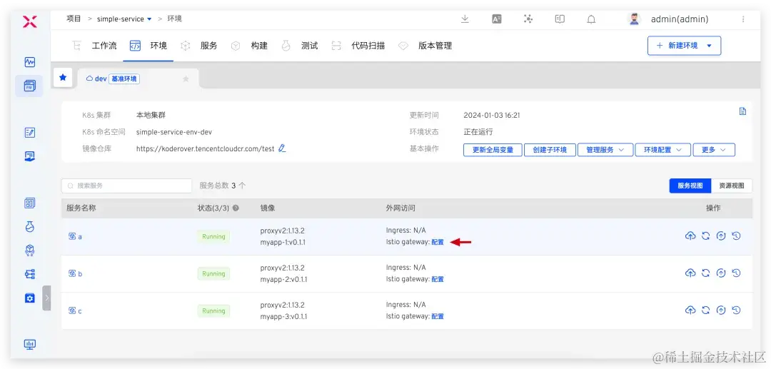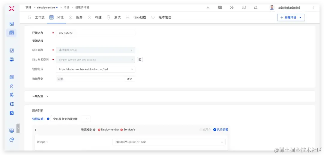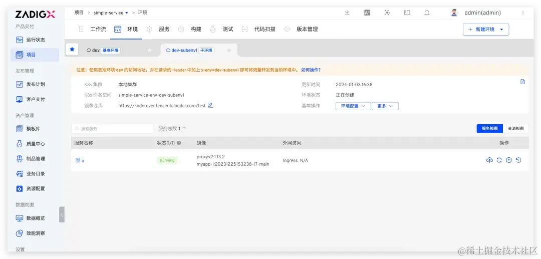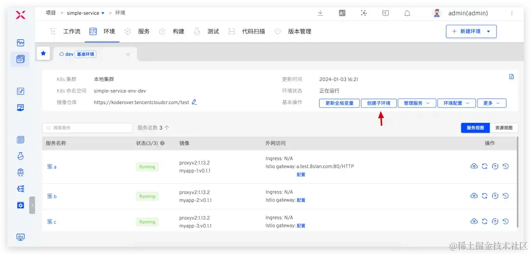 在 dev 基准环境中通过点击 创建子环境,选择 a 服务可创建包含 a 服务的子环境 dev-subenv1。
