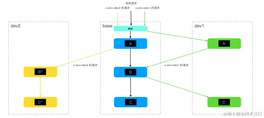 当开发者需要进行开发、联调时,比如涉及到到 A 和 C 两个服务的变更,可以基于基准环境新建 dev1 子环境,该子环境中仅部署变更后的 A 和 C 服务,即 A' 和 C'。联调时请求加上灰度标,如在 http header 中设定 x-env=dev1 的灰度标,此时请求会按照 A' -> B -> C' 进行。