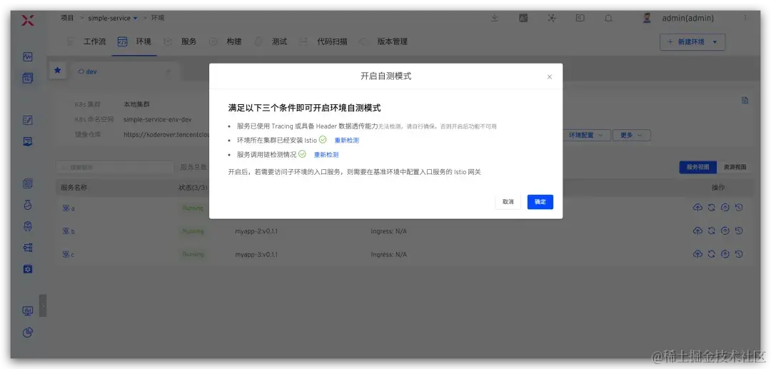 2. 系统会对 Istio 是否安装做自动检查,如果没有请在环境所在集群进行安装