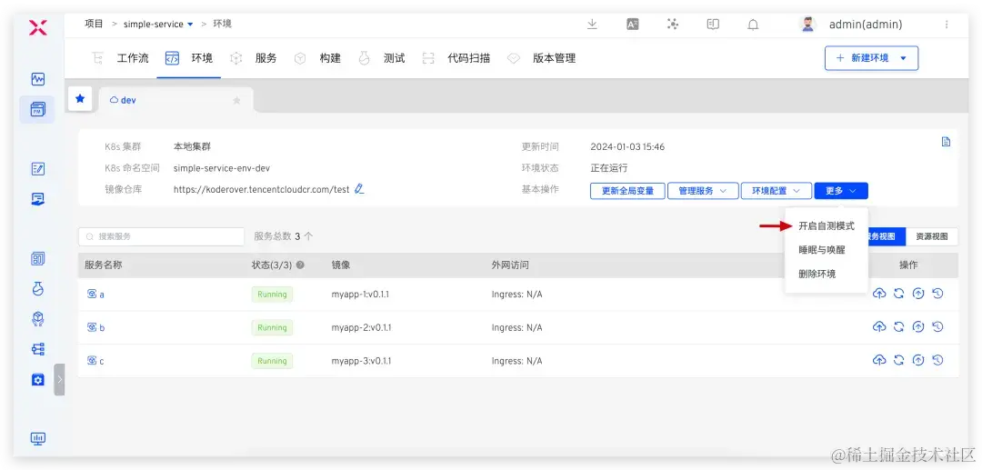 访问 dev 环境 > 更多 > 点击开启自测模式