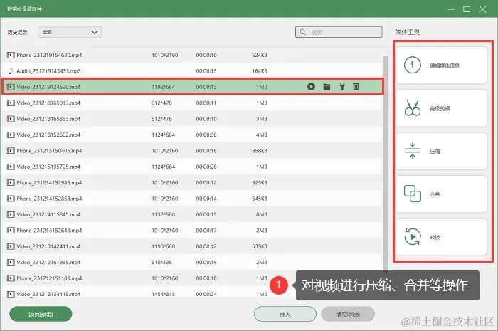 第4步:此外,在历史记录页面,软件还提供了视频压缩、转换、合并等功能,用户可以根据自己的需求进行操作。