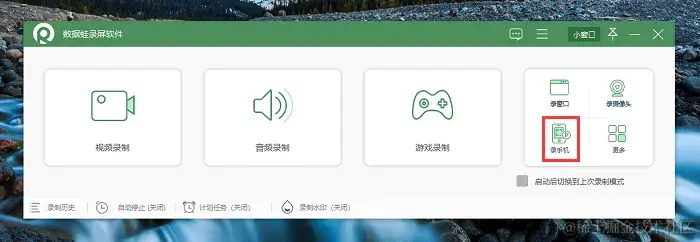 第1步:点击电脑桌面上的“数据蛙录屏软件”图标,打开它,在页面可以看见多种录制模式,如游戏录制、手机录制、音频录制等,我们选择 “录手机” 。
