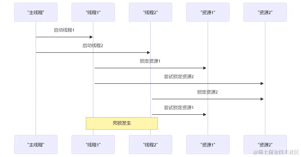 在这个例子中,如果线程1和线程2分别锁定了资源1和资源2,然后又都在尝试获取对方持有的资源,这就导致了死锁的发生。