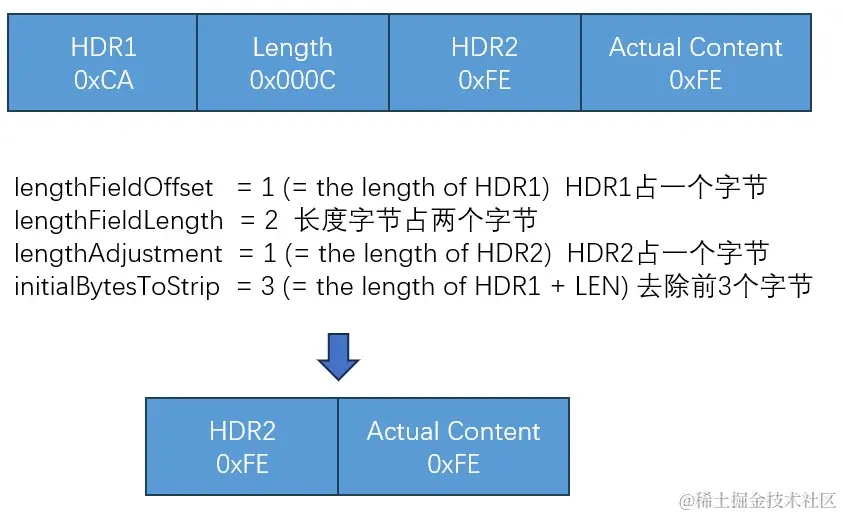 如果我们想在收到的报文里面移除头部,那么可以将lengthAdjustment赋值为-2,这样解码之后移除的头部就会只包括内容本身。那如果我们的报文如下所示呢: