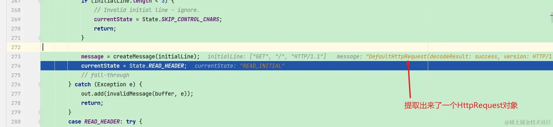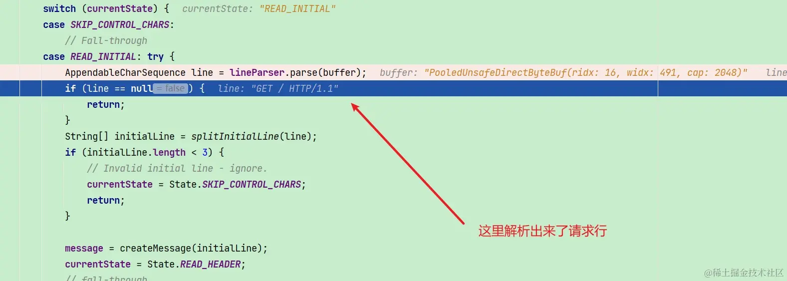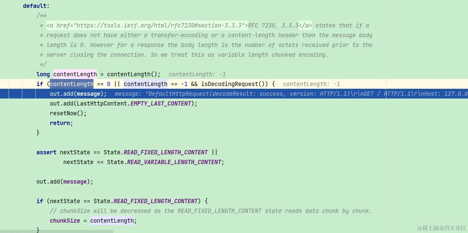 我们还是选择调试代码来看看Netty的HttpObjectDecoder的decode是如何解析HTTP报文的: