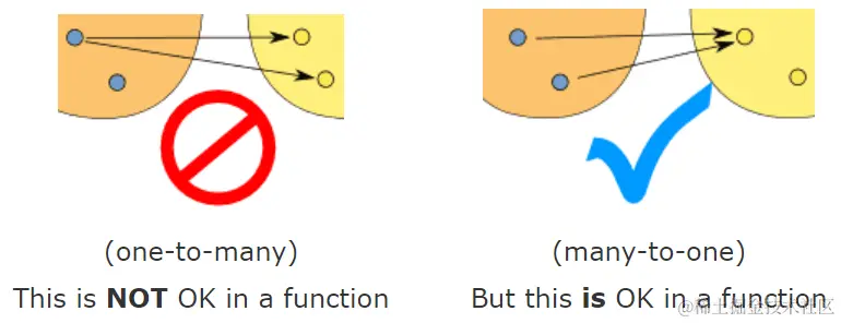 即每个在值域内的输入都能得到唯一的输出,它只可能是多对一而不是一对多的关系: