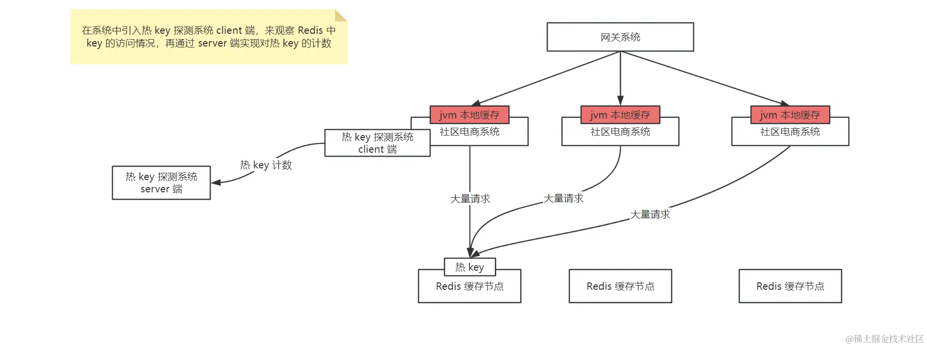 那么对于热 key 的处理就是通过热 key 探测系统对热 key 进行计数,一旦发现了热 key,就将热 key 在 jvm 本地缓存中再存储一份,那么当再有大量请求来读取时,就直接在应用的 jvm 缓存中读取到直接返回了,不会再将压力给到同一个 redis 节点中了,如下图: