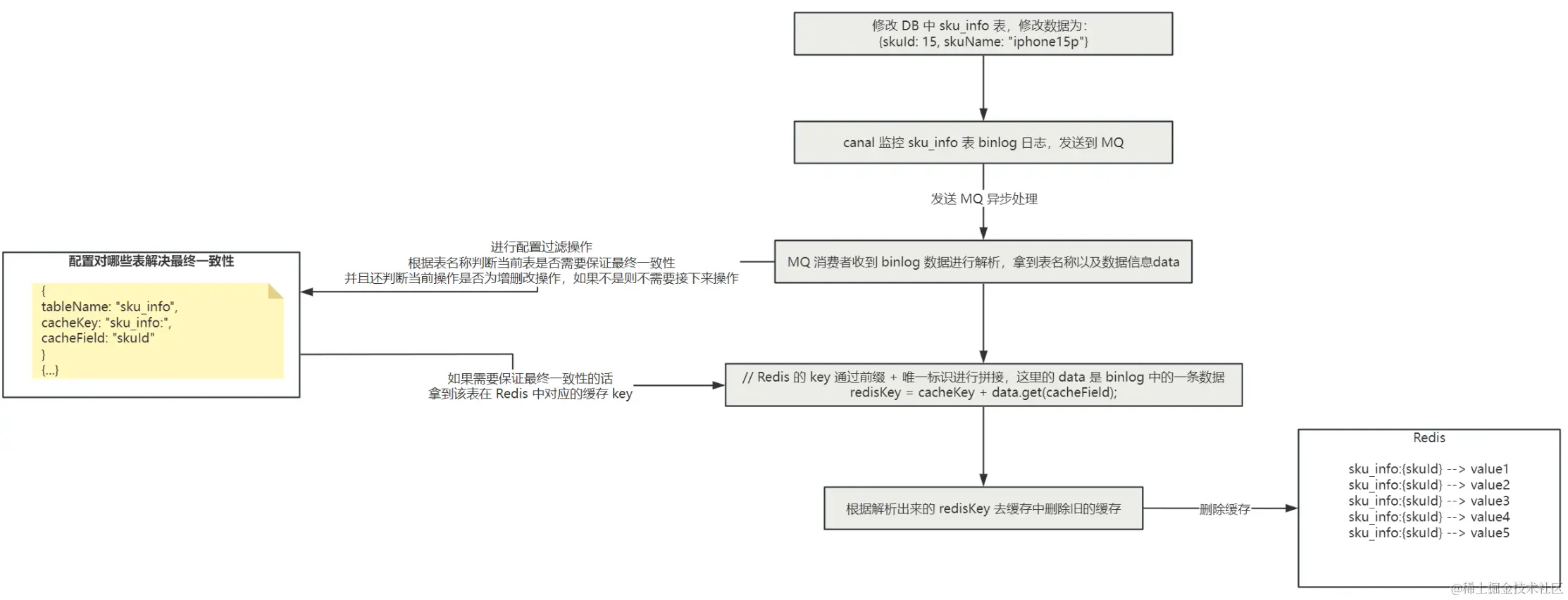 可以我们自己来进行配置,比如说监控 sku_info 表的 binlog,那么在 MQ 的消费端解析 binlog 之后,就知道是对 sku_info 表进行了增删改的操作,那么假如 Redis 中存储了 sku 的详情信息,key 为 sku_info:{skuId},那么我们就可以在一个地方(可以在配置文件中,也可以在枚举类中进行配置)对这个信息进行配置: