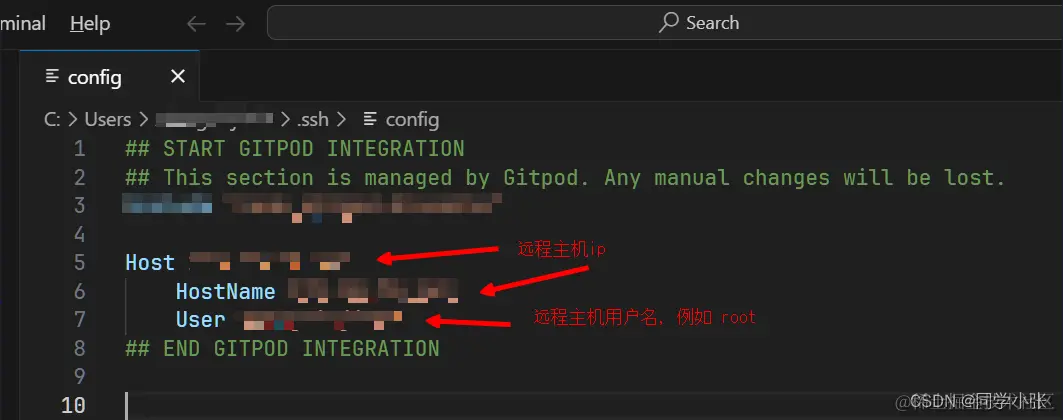 - 第四步:修改config文件中内容,主要是填写 Host,HostName, User,注意格式和缩进。