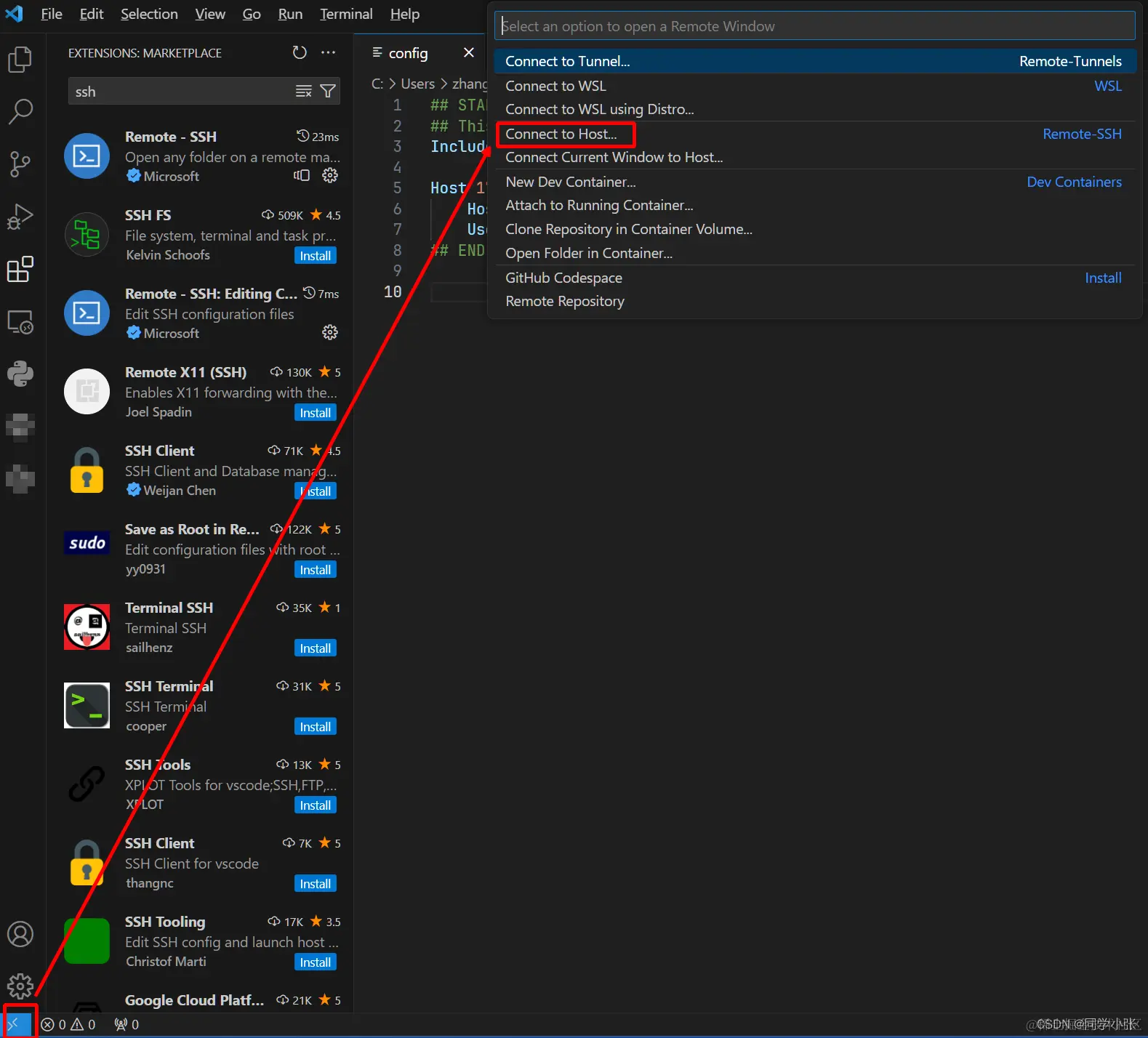 - 第五步:VSCode 通过SSH链接远程服务,点击左下角图标,选择"Connect to Host......"