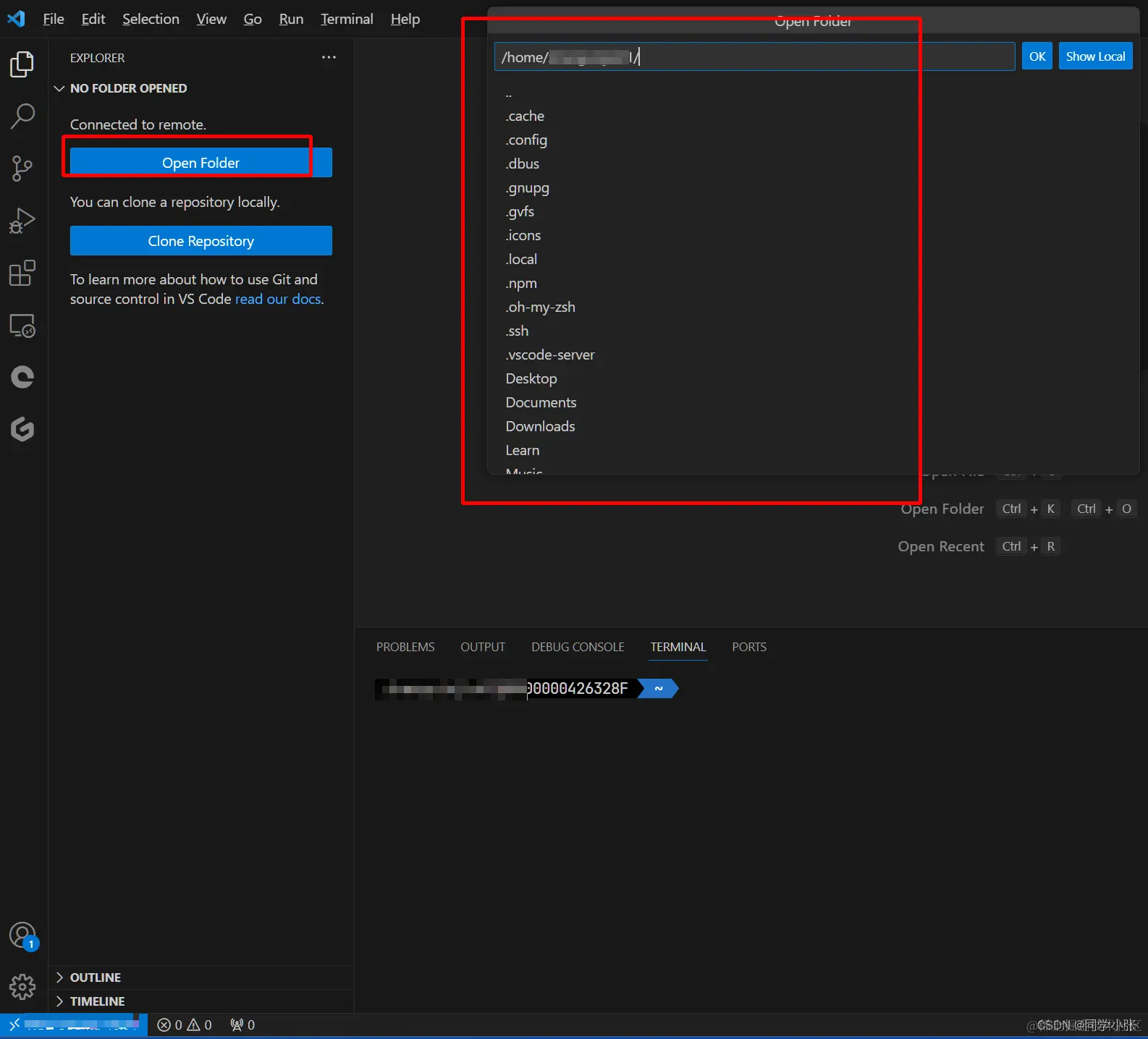 第六步:选择远程服务上的文件夹,打开,然后就可以在本地vscode中编辑内容了。