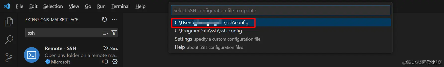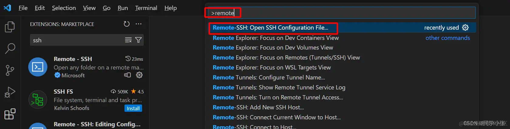 - 第二步:修改配置, ctrl + shift +p快捷键打开下面的输入框,输入“remote-”,找到红框中的“open ssh config....”,点击