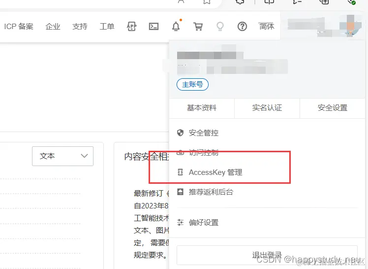 在使用内容检测API之前,需要先注册阿里云账号,然后需要创建,记住自己的accesskey和secret。
