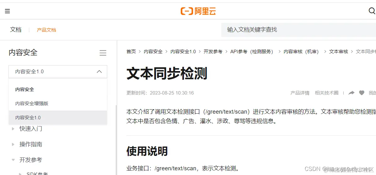 当然我也把文档地址给大家。大家也可以自己去看。如何调用文本检测接口进行文本内容审核_内容安全(Content Moderation)-阿里云帮助中心
