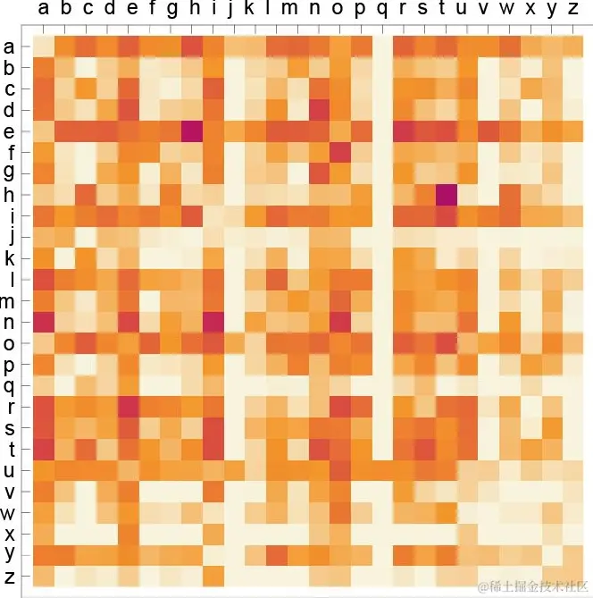 既然ChatGPT总是根据概率来选择下一个词语,那么概率又是从何而来呢?书中举了一些简单的例子,比如随机取一段英文文本,统计其中不同字母出现的次数,就能生成相应的概率图。当使用逐渐变长的 n 元字母的概率生成“随机的词”,就能发现它们会显得越来越“真实”。下图是一元字母概率图和二元字母概率图,其中二元字母概率图中可能出现的第一个字母横向显示,第二个字母纵向显示,颜色越深代表概率越高。