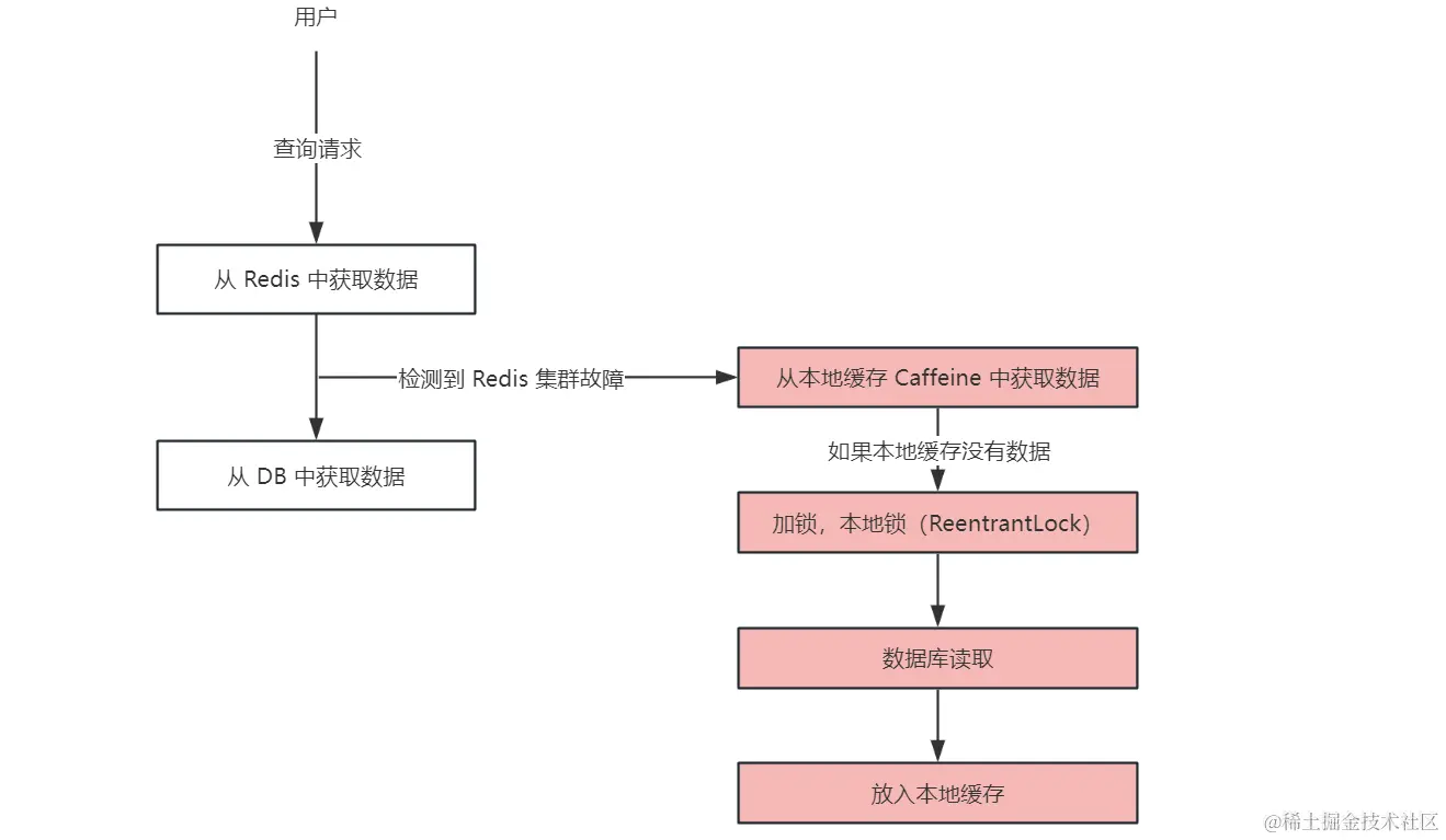 如果 Redis 故障的话,通过 key=redis_connection_failed 就已经记录下来了,那么降级操作的话,就从本地缓存 caffeine 中取数据,如果取不到,再查询数据库,降级流程如下: